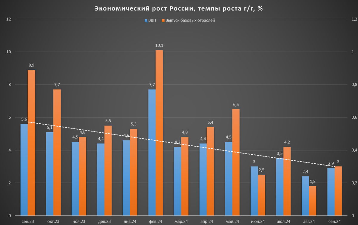 Итак, по итогам сентября ежемесячная оценка ВВП (от Минэкономразвития РФ) продолжает замедляться относительно прошлого года: 2,9% сентябрь 2024 vs 5,6% сентябрь 2023 года. Выпуск (производство) товаров и услуг по итогам сентября (от Росстата) так же замедляется вместе с ВВП: 3% сентябрь 2024 vs 8,9% сентябрь 2023 года.