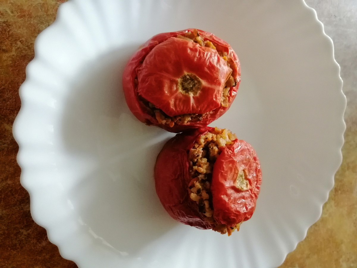 Помидоры с мясом и рисом-полноценное вкусное блюдо на обед или на ужин. Попробуйте приготовить, не пожалеете! Подготовим продукты: *15 штук средних помидор; *700 грамм свино-говяжьего фарша; *1/2 стакана риса; *1 головка репчатого лука; *1 крупная морковь; *2 зубчика чеснока; *1/2 пучка зелени; *Растительное масло 2 столовые ложки; *Соль по вкусу. 1.Помидоры помыть, отрезать верхушки. Чайной ложкой выбрать из помидора всю "мякоть". Это очень просто, проще, чем кажется. 2.Рис промыть и отварить. 3.Обжарить на растительном масле лук и морковь. 4.Измельчить в блендере "мякоть" помидор, добавить к ней мелко нарезанный чеснок и зелень и добавить всё это к луку и моркови. 5.Прижарить фарш на сковороде 5 минут и протушить в томатном соке с овощами до выкипания жидкости, примерно 15-20 минут. 5.Добавить к получившейся смеси отваренный рис, всё перемешать, присолить. 6.Нафаршировать помидоры, поместить их в форму и запечь в духовке в течении 15-20 минут при температуре 180 градусов.