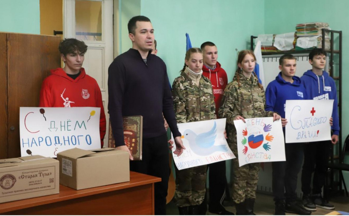 Активисты организовали в Туле праздничные мероприятия. В честь Дня народного единства добровольцы побывали в военном госпитале на улице Советской в Туле. Здесь располагается ФГУ «39-й Отдельный медицинский отряд (аэромобильный) воздушно-десантных войск», где проходят лечение участники спецоперации. Волонтеры уже не первый раз посещают это учреждение и благодарят российских военнослужащих за защиту нашей Родины. Также в рамках акции «Спасибо врачам» выражают признательность медикам, персоналу госпиталя за спасенные жизни солдат и офицеров. Совместно с депутатом Тульской городской Думы, руководителем аппарата регионального отделения МГЕР Павлом Астафьевым активисты МГЕР и «Волонтерской роты» поблагодарили бойцов и медицинских работников за их труд, исполнили композиции, сочиненные представителем «Молодой Гвардии» Матвеем Степиным и передали тульские пряники. «В рамках празднования Дня народного единства сегодня мы поздравили военнослужащих, проходящих курс лечения и реабилитации после по