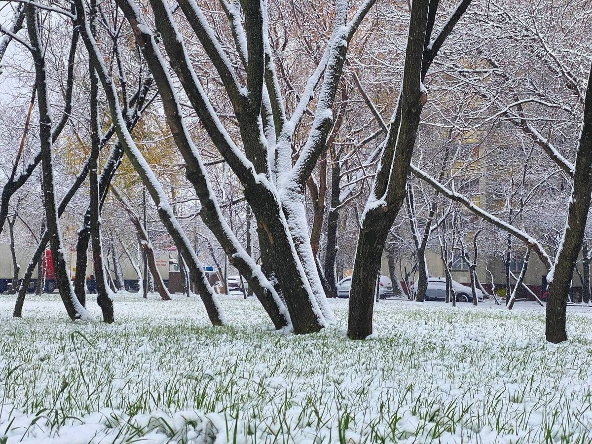 Сегодня ночью природа устроила настоящее волшебство. Всю ночь шел первый снег, мягко и почти незаметно, словно легкое прикосновение. Мелкие снежинки перемешивались с дождем и оставляли тонкую белую вуаль на земле. Утром, когда мы вышли на прогулку, снег всё еще падал, уже с ветром, и казалось, что мир вокруг медленно, но неумолимо погружается в зиму. Ощущение было, будто этот снег выпал неожиданно для всех — и для людей, и для самой природы. Снег везде: на дорогах, на траве, и, самое удивительное, на зелёных кустах и ветках. Это сочетание зелени и свежего, ещё не утрамбованного снега завораживало. Кажется, осень ещё вчера царила здесь своими насыщенными желтыми оттенками, а теперь природа, словно по велению волшебной палочки, резко сменила картину. Оглядываясь по сторонам, ловлю себя на мысли: куда делись все желтые листья? Буквально день назад деревья и дорожки были усыпаны ими, создавая золотистую атмосферу, и вот, вдруг исчезло всё это богатство красок. Словно зима пришла, не преду