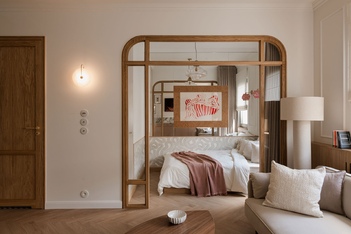 Фотограф: ONI Studio Источник: Yatzer Эта квартира сразу предназначалась под краткосрочную аренду, но, кажется, заказчики с дизайнерами даже не пытались сделать ее “антивандальной” и в целом особо не экономили, как это бывает в подобных проектах. Отделка из камня и дерева, сделанная на заказ мебель и изящная фурнитура (см. ручки мебели и выключатели с розетками). Разве что хранение, традиционно для арендных квартир, довольно скупое. Чтобы квартира выглядела попросторней, дизайнеры сделали везде олинаковый паркетный пол и обошлись без навесных кухонных шкачиков — места для готовки и хранения посуды здесь и так предостаточно. Лучше всего удалась спальня: зеркало в торце в комбинации с арочным порталом дают иллюзию анфилады. Я, признаться, поддалась ей настолько, что поначалу решила, что зеркало одели в раму, повторяющую форму столярки. Зеркальные стены в спальне — прием неоднозначный, но в окружении красивой столярки, в комплекте с витиеватыми обоями и большой картиной у меня он никак