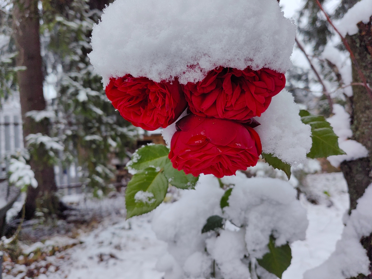 А розы, придавленные первым снегом, кряхтят, пытаясь разогнуться.