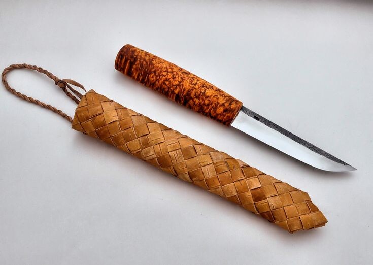 Вы можете сделать чехол из берёзовой коры, предварительно нарезанной на полоски. Если полоски для плетения сделаны из пластин, вам нужно склеить две полоски, чтобы получить достаточно длинную полоску для плетения. Лучше всего склеивать полоски на узком конце, там, где мы начинаем делать чехол. Следующее, что нужно сделать, — это вырезать и придать форму деревянному вкладышу ножен. Лучше это сделать до того, как мы начнём плести ножны, потому что вкладыш определяет форму бедующих ножен. Вы можете использовать практически любую древесину, но традиционно подкладка ножен делается из ольхи или берёзы. Сначала нужно вырезать место для клинка, а затем придать подкладке форму, сужающуюся к наконечнику. Важно чтобы кончик имел угол 90 градусов, иначе плетение будет проходить со сложностями.