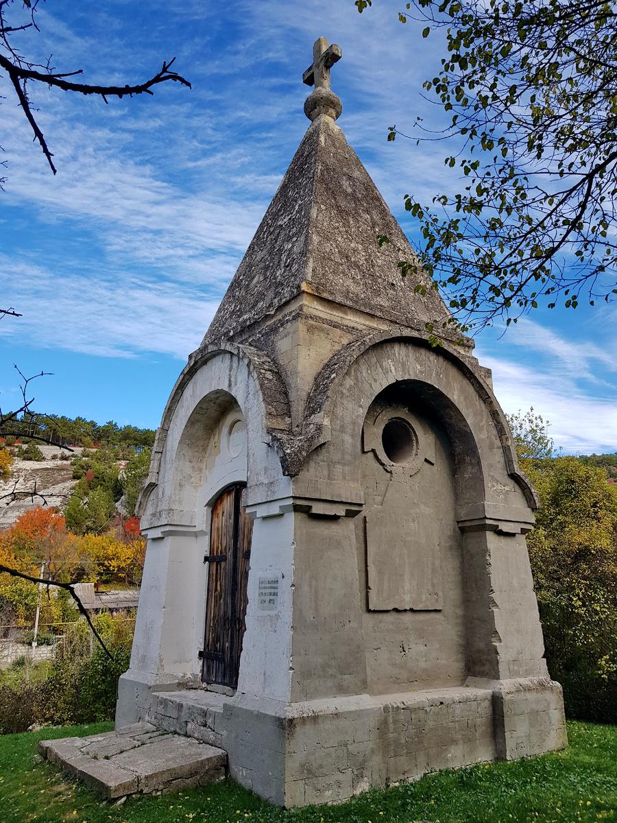 В свое время, изучая краеведческую литературу, я обратила внимание на упоминания о том, что в старой части Бахчисарая существует часовня Архангела Михаила, и даже какие-то ее фото я видела, но местоположение я толком определить не могла (наверное, потому, что «Русская слобода» в Бахчисарае для меня terra incognita ). В конце концов, выяснила, что часовня возведена на старом Братском кладбище русских воинов Крымской войны, умерших от ран в госпиталях, которые располагались как в Свято-Успенском монастыре, так и в Ханском дворце. Исследования печатных новостей и современной периодики не обнадеживали: кладбище, на котором нашли вечный покой русские герои, заброшено, надгробия разбросаны, часовня закрыта и ветшает. Впрочем, есть информация, что иногда ее открывают, и даже какие-то особые службы в ее стенах проводятся. Но концов найти не удалось, и даже в храме, который мы посетили утром (Храм Феодоровской иконы Божией Матери), сильно удивились: что за часовня, что за службы?.. Ну, если уж совсем честно, то нашелся ВКонтакте очень знающий человек, который, наверное, мог бы реально помочь, но мне показалось, что мое намерение посетить эти места он расценил, как праздность. И развивать коммуникацию дальше я постеснялась. Потому отправились к часовне сами.
