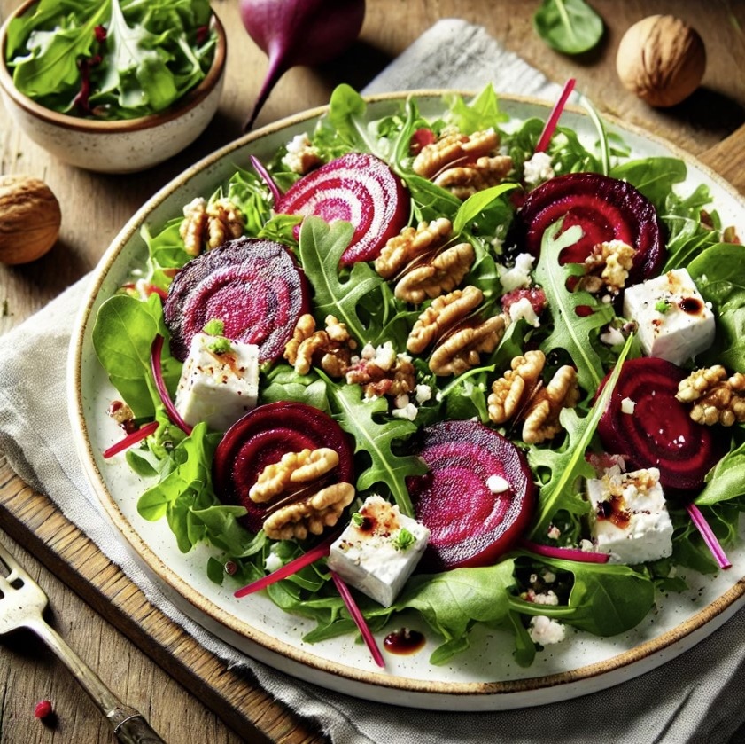 Этот салат сочетает сладость запеченной свеклы с мягким козьим сыром и хрустящими орехами. Идеально подходит для осеннего обеда или ужина. Ингредиенты: Салат лучше всего подавать сразу, чтобы листья салата оставались свежими и хрустящими. Это блюдо может быть как самостоятельной закуской, так и гарниром.