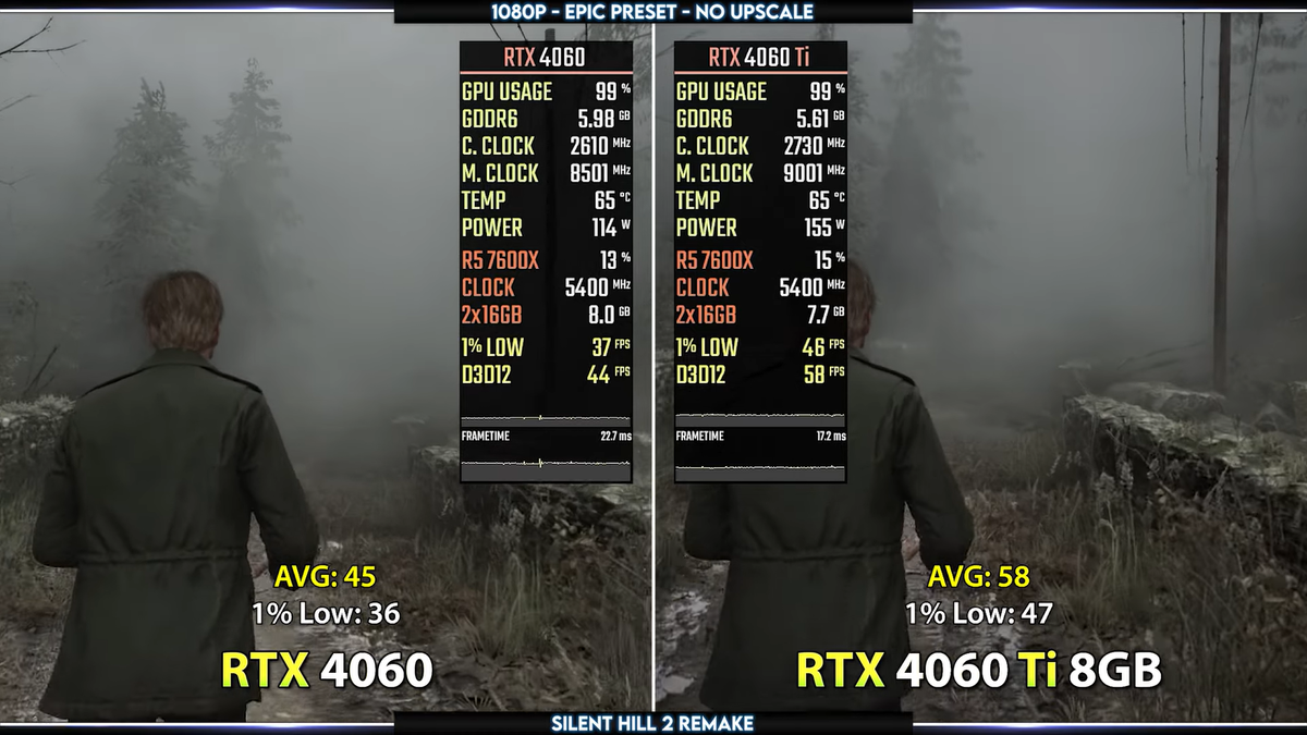 На YouTube-канале NJ Tech выяснили, какой игровой производительности можно ожидать в Full HD от видеокарт RTX 4060 и 4060 Ti. Silent Hill 2 Remake тестировалась с пресетом Epic. Средняя производительность в ней составляла 45 к/с (RTX 4060) и 58 к/с (RTX 4060 Ti). God of War Ragnarök шла с ультра-графикой, TAA. В среднем в этой игре удалось получить 69 к/с (4060) и 84 к/с (4060 Ti). С DLAA, DLSS 3 FG эти показатели равнялись 115 к/с и 138 к/с соответственно. В игре Black Myth Wukong на высоких настройках графики с TSR средний FPS находился в районе 52 к/с (4060) и 64 к/с (4060 Ti). Cyberpunk 2077: Phantom Liberty запускалась с ультра-пресетом. Средняя частота кадров здесь равнялась 65 к/с (с 4060) и 75 к/с (с 4060 Ti). Call of Duty: Modern Warfare III тестировалась с графикой Ultra. В среднем производительность в этой игре составляла 109 к/с (4060) и 120 к/с (4060 Ti). Counter Strike 2 запускалась с высоким пресетом. Средний FPS в игре равнялся 241 к/с (RTX 4060) и 303 к/с (RTX 4060 Ti)
