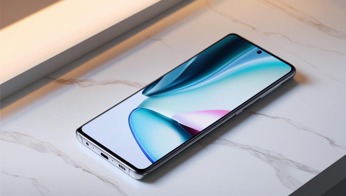 Элегантный современный смартфон с ярким экраном, на котором отображаются показатели высокой производительности, в окружении футуристических технических элементов, таких как схемы, значки процессоров и графики скорости, на фоне динамичного красочного абстрактного рисунка...