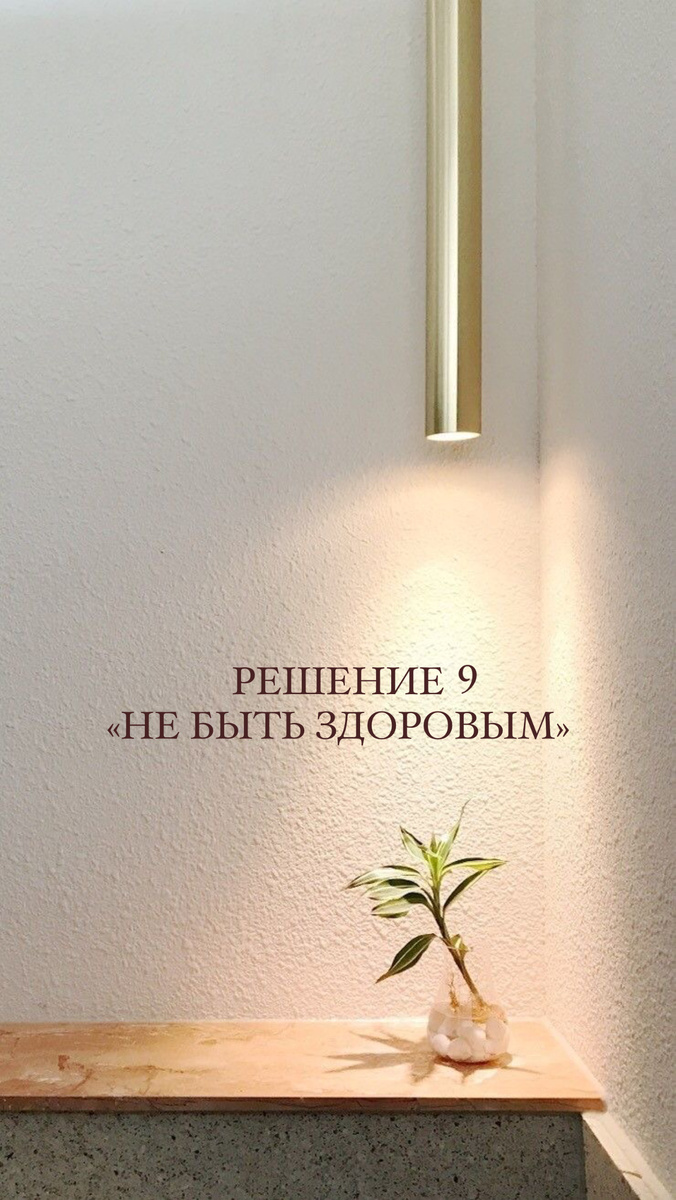 Решение 9 «Не быть здоровым» Подробнее о каждом решении в ТГ канале https://t.me/+wcZvpKeyU5I2NzBi Как проявляется это решение в жизни Как следует из названия, человек часто болеет. Это могут быть простудные заболевания и другие заболевания, которые, как правило, относят к психосоматическим. Если (все пункты или часть) человек: При решении «Не быть здоровым» Что можно делать самостоятельно❤️: В терапии Цель терапии - изменить детское решение, что только через болезнь можно получать внимание, отдых, заботу и прочие жизненные блага и освоить новые более благополучные способы реализовывать свои потребности, не заболевая каждый раз. Психосоматика не всегда бывает именно от послания «Не будь здоровым». Есть и другие варианты: При запрете на выражение агрессии эта агрессия может направляться против себя, и выражаться в психосоматике. Симптом так или иначе выражает некое внутреннее неблагополучие или конфликт. Нет большого смысла работать только на уровне симптома, не касаясь гл