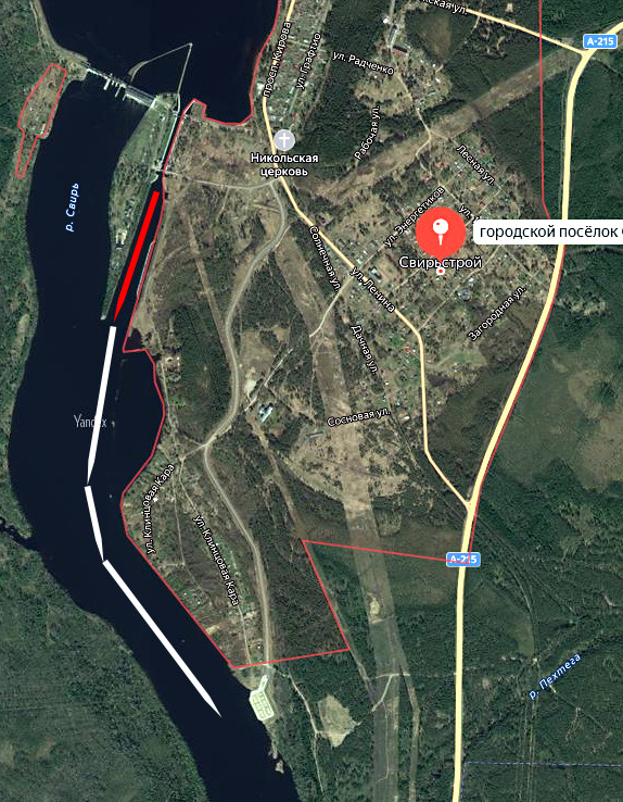 После прохождения в предыдущей статье Нижне-Свирского гидроузла наш виртуальный лайнер продолжит плавание вниз по Свири. Сегодняшний маршрут пролегает от нижнего подходного канала гидроузла к южной границе посёлка Свирьстрой. Общий вид гидроузла и левого берега снизу по течению в 2011 году. Слева виден нижний бьеф гидроэлектростанции, в центре – выход из подходного канала, справа – залив у левого берега. От основного русла залив отделён осерёдком. Осерёдок (осерёдыш) – наносное отложение в русле реки, не имеющее растительности и не примыкающее к берегу. Во время высокого уровня воды затапливается, а в межень осыхает (как на снимке). Бывает искусственного происхождения – например, при проведении дноуглубительных работ. Полагаю, в Свирьстрое он так и образовался. Тот же ракурс, снимки с разницей в один день, только этот сделан на 13 лет позже. В 2011 году уровень воды в Свири был заметно ниже. Северная часть посёлка Свирьстрой расположена выше Нижне-Свирского гидроузла, южная часть – ниж