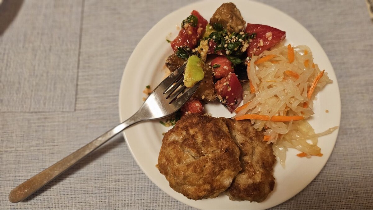 Тааак, чего там у нас сегодня? 1. Овощи в разных видах: квашеные, свежие, варёные; 2. Котлетки из филе индейки в духовке; 3. Ягоды земляники лесной протертые БЕЗ сахара; 4. Чай травяной с мятой, таволгой, земляникой и ферментированной хвоей; Салат с хрустящими баклажанами: - Томаты свежие режем кубиками; - Авокадо, если есть, режем кубиком; - Сыр сиртаки или мягкий творожный сыр добавляем по вкусу, у меня не было сегодня и я просто посыпала тёртым сыром; - Половину луковицы тонко режем кольцами, отправляем в соленую холодную воду и оставляем на 10мин; - Баклажаны режем крупным кубиком, отправляем в холодную соленую воду на 15мин; - Баклажаны перекладываем в пакет, пересыпаем их картофельным крахмалом и трясем так, чтобы все кубики покрылись белым слоем; - Отправляем баклажаны на сковороду с маслом и обжариваем до золотистой корочки; - Баклажаны отправляем на бумажное полотенце, они должны остаться хрустящими; Томаты, лук, сыр, авокадо смешать в миске, выложить на поднос. Сверху посыпат