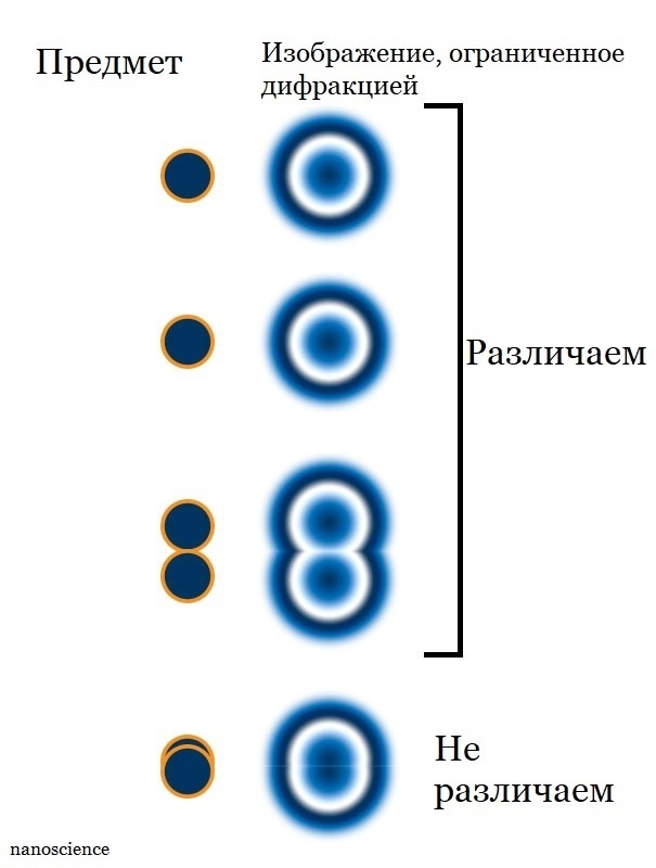 Человеческий глаз может различить две точки на расстоянии 0.2 мм друг от друга. Это расстояние называется разрешающей способностью или разрешением. Чтобы различить более близко стоящие точки, нам нужна помощь инструментов. И первое, что изобрели — это линзы и световой микроскоп. Современный световой микроскоп имеет максимальное увеличение около 1000x. На увеличение влияет количество и качество линз, а также длина волны света, используемого для освещения. Мы видим в белом свете, который состоит из всех цветов видимого спектра с длиной волны от 400 до 700 нанометров (нм). Когда мы рассматриваем что-то в световой микроскоп, свет проходит через несколько маленьких отверс