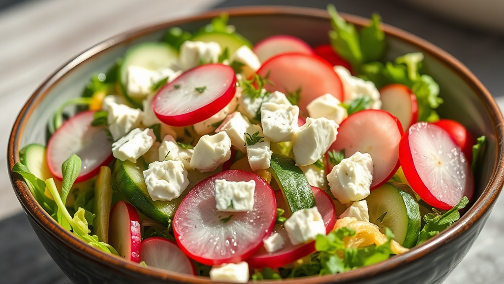 Обалденно вкусный салат всего из 4 продуктов! Готовим через день Сегодня я предлагаю вам приготовить салат, в котором всего четыре основных ингредиента — и это совсем не значит, что его вкус будет простым! Все дело в сочетании и качественных продуктах. Будем использовать местные овощи, которые сейчас в сезон, и немного креативности. Поверьте, из такого минимализма может получится настоящая кулинарная находка! Итак, нам понадобятся: 1. Свежий редис 2. Хрустящий огурец 3. Мягкий сыр (например, брынза или творожный сыр) 4. Укроп или другая зелень по вкусу Первое, что нужно помнить — выбирайте только свежие и качественные продукты. Это как основа будущего шедевра. Если вы можете, купите огурцы и редис на местном рынке. Они несут в себе дух земли, солнечного света и, что очень важно, сезонности. Нам же нужно, чтобы каждый укус был полон яркого вкуса и аромата. 1. Начнем с редиса. Возьмите несколько крупных и свежих корнеплодов. Нарежьте их на тонкие кружочки — такой нарезкой мы добьемся, чт