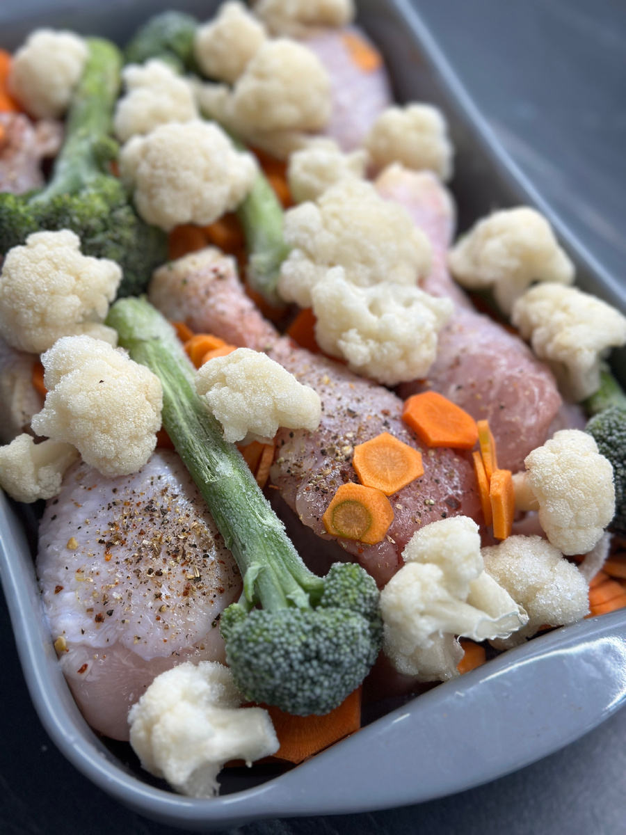 Куриные ножки с овощами: брокколи 🥦 , цветная капуста, морковь🥕 . ПП-ужин.