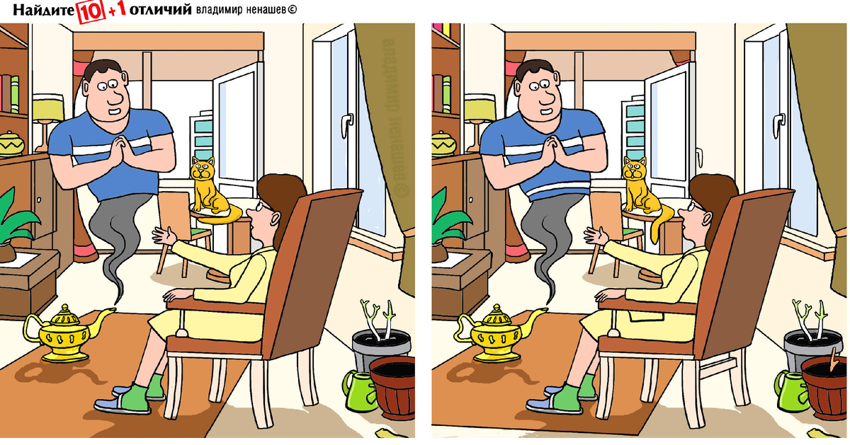 Друзья, сегодня семейная обстановка располагает к поиску отличий. Сюжет понятен всем. Муж, жена, сказки и лампа Аладдина. Ответ Владимир Ненашев/Ура жизни