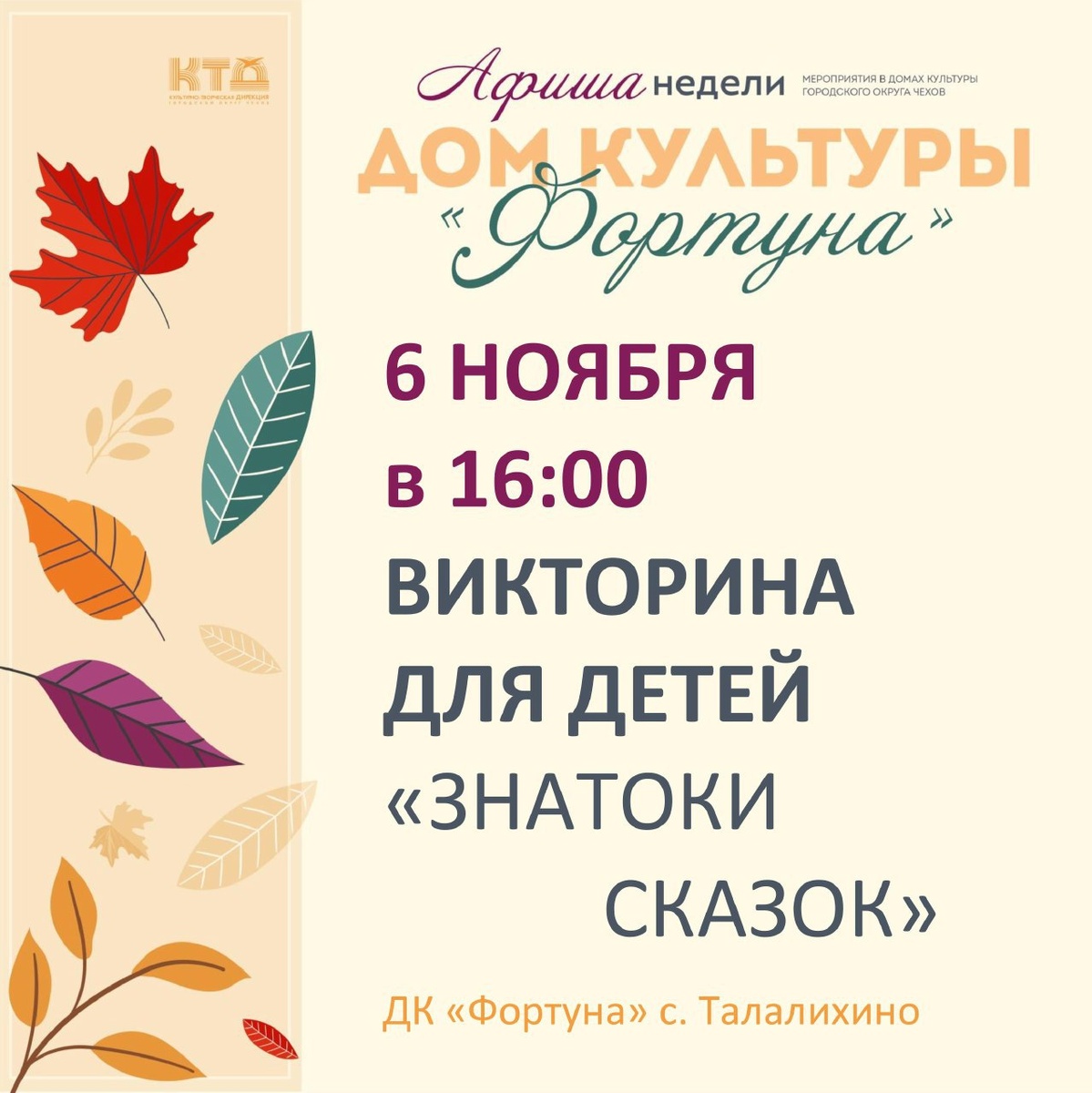 💥 Афиша на неделю ДК «Фортуна» г.о. Чехов Афиша мероприятий с 4 по 10 ноября. 🚫 Возраст: 0+ 📆 06.11.2024 🕕 16:00 🏢 ДК «Фортуна» 📍 г.о. Чехов, с. Талалихино, ул. Спортивная, д.20 🪙 Стоимость билетов - Бесплатно❗️ #ДКФортуна #Талалихино #КТД #ГоспабликиМО #ГородскойОкругЧехов