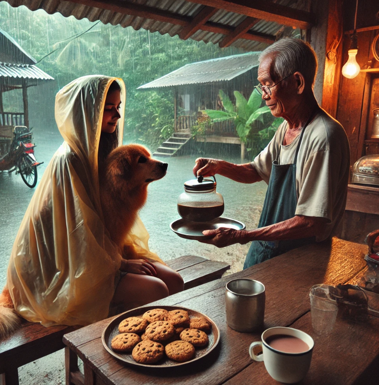 День на острове Ко-Пай в Таиланде начался с лёгкого дождя. Сезон дождей был в самом разгаре, и каждая капля, падающая с небес, приносила с собой ощущение уюта и свежести. Яо, старая, добрая собака, любила такие деньки. Она бродила по влажным тропинкам, чувствуя, как капли воды аккуратно падают на её шерсть. Воздух был наполнен ароматом дождя, а где-то неподалёку слышались голоса местных жителей, которые тихо переговаривались, укрываясь под крышами. Яо неторопливо направилась к своему любимому месту — маленькому кафе на краю деревни. Хозяин кафе, мистер Сомчай, всегда встречал её с улыбкой и чем-то вкусным. Он обожал готовить, особенно в такие дождливые дни, когда в воздухе висела особая атмосфера уюта. Сегодня аромат свежевыпеченного печенья разносился по округе, и Яо знала, что её ждёт маленькое угощение. Мистер Сомчай уже был на своём месте — он сидел за стойкой и смотрел на капли дождя, стекающие по стеклу. Услышав лёгкий скрип двери, он обернулся и увидел Яо. "А вот и ты, моя стару