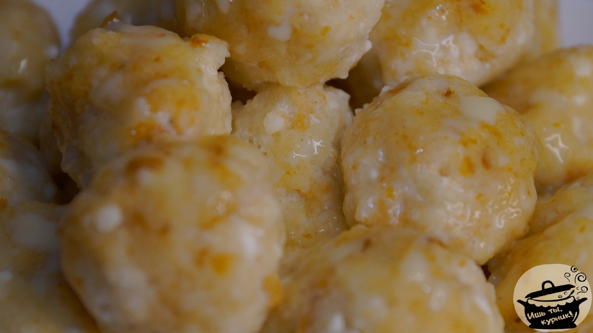 Ингредиенты: · творог – 350 гр.; · яйцо – 1 шт.; · мука (или панировочные сухари) – 3 ст.л.; · манная крупа – 3 ст.л.; · сахар – 5 ст.л.; · ванилин – щепотка; · корица – по вкусу. Приготовление: Смешать все ингредиенты, тщательно вымесить. В зависимости от жидкости творога может понадобиться увеличение количества муки (+2 ст.л.). Дать настояться 10 минут. В кастрюле вскипятить воду и, сформировав шарики, размером с грецкий орех, опускать сырники в кипяток. Варить 3 минуты, периодически помешивая. Перед подачей полить сгущенкой или сметаной по желанию. Приятного аппетита!