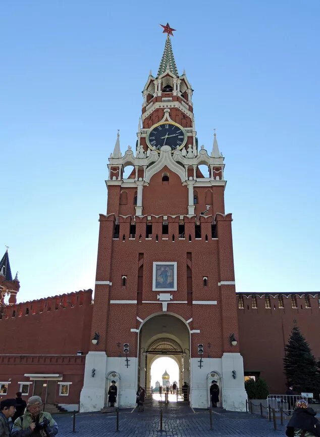 До 1930-х годов с западной стороны Спасской башни над воротами и памятной табличкой размещались образы Спаса Нерукотворного и Печерской Богоматери с предстоящими ей святителями московскими Петром и Алексием.