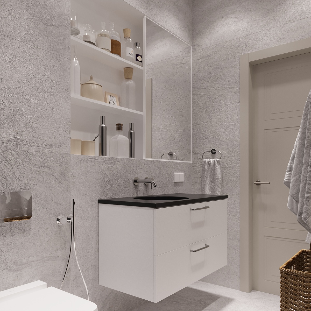 Два помещения «привели в порядок». Возможно так сразу и не заметно, но должно быть практически все учтено, я, в каком-то смысле перфекционист, поэтому стараюсь декор и мелочи даже на визуализациях определить на свои места. Развеска картин - важная деталь. Без произведений искусства, красивой посуды, текстиля- интерьер кажется «голым». В оформлении проемов из коридора в спальню и гостевую комнаты я убрала два небольших молдинга, поскольку они «резали» глаз, мешали восприятию. В ванной комнате добавили детали декора. На этом остановились. Поскольку в проект был приведен очередной «консультант», подруга, она же человек, занимающийся кухонной мебелью…. В любом случае, произошел очень не корректный момент, после которого сложно продолжать работу. Сразу скажу, я взяла проект после других дизайнеров, это должно всегда настораживать. Проектирование я начала «с нуля», с нашими замерами, уже с разработанными мной вариантами планировок. С заказчиками я не обсуждала работу с предыдущими дизайнера