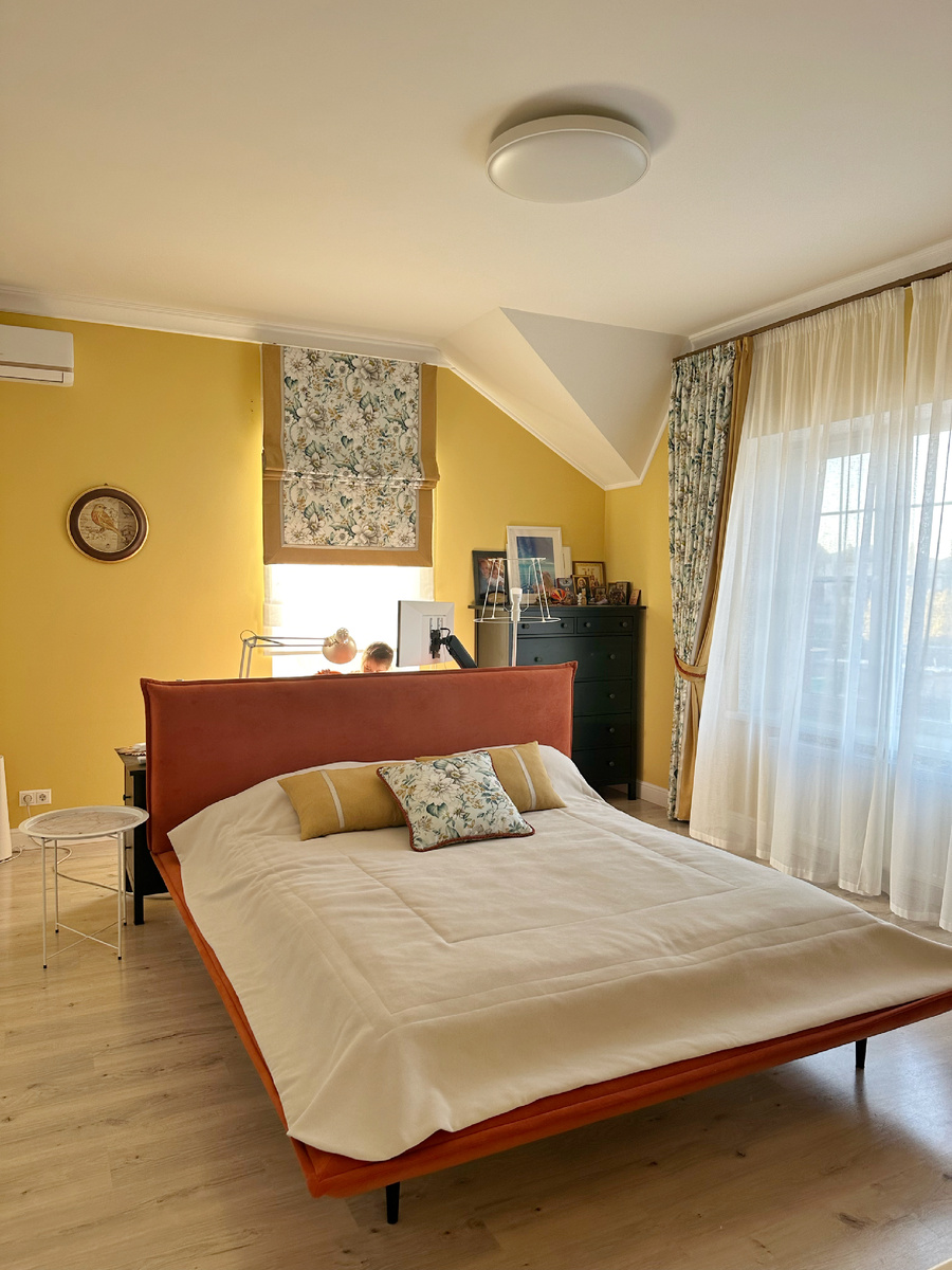 Комплект штор для спальни. Желтые стены и яркий цветочный принт на портьерах. Покрывало более нейтральное. Портьеры отделаны Кантом с внутренней стороны. Тюль молочный лен. Римская штора двойная. Нижний слой тюль лен, верхний слой на подкладке блэкаут. Детали при ближайшем рассмотрении. Канты, тесемки и подхваты. Подушки и портьеры из тех, же материалов для соединения в интерьере.