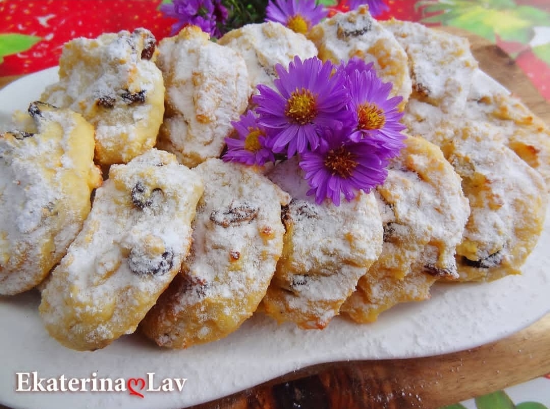 Всем привет! Сегодня хочу поделиться рецептом быстрого и очень творожного печенья. В нём много творога и минимальное количество масла и муки. По структуре печенье мягкое, а по вкусу очень напоминает сырники. Вкусно и не хлопотно 👍😊. ИНГРЕДИЕНТЫ: 🔸Творог (9%-ный) - 350-360 г 🔸Мука - 1/2 ст (80 г) 🔸Сахар - 3 ст.л 🔸Желток - 2 шт 🔸Сливочное масло - 20 г 🔸Ванильный сахар - 1 ч.л 🔸Разрыхлитель - 1/2 ч.л 🔸Соль - небольшая щепотка 🔸Изюм - 50 г 🔸Сахарная пудра (для украшения) ПРИГОТОВЛЕНИЕ: 1️⃣ Первым делом заливаю изюм не слишком горячей водой и даю постоять 5-10 минут. 2️⃣ Для приготовления творожного печенья я беру пастообразный, не сухой творог в пачках (2 пачки по 180 г). Смешиваю его с мягким сливочным маслом, сахаром, ванильным сахаром, солью и желтками. Затем всыпаю муку, разрыхлитель и замешиваю тесто. 3️⃣ Процеживаю изюм, дополнительно прослушиваю его бумажным полотенцем, после чего добавляю к тесту и хорошо перемешиваю. 4️⃣ С помощью двух ложек выкладываю небольшие холми