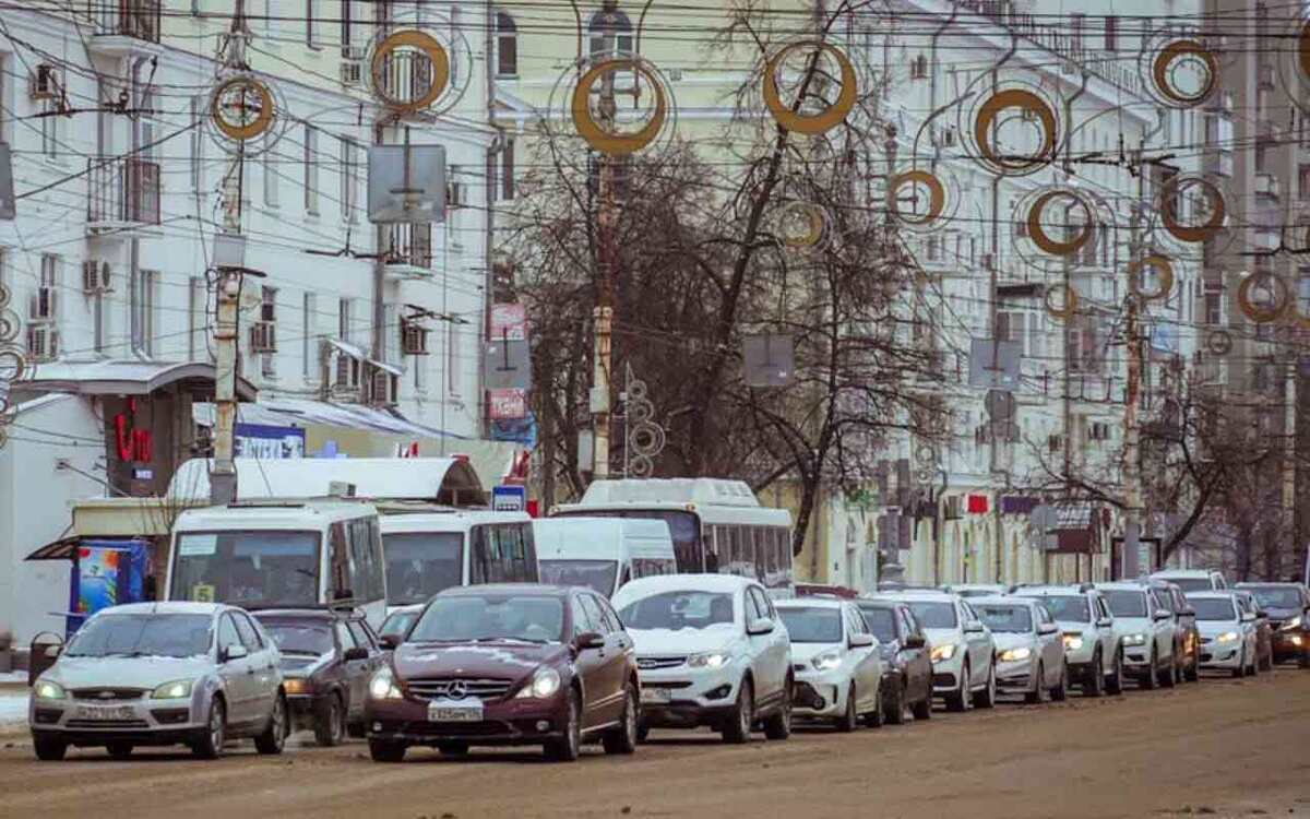 Стоят машины на улице Ленина и в начале проспекта Революции.