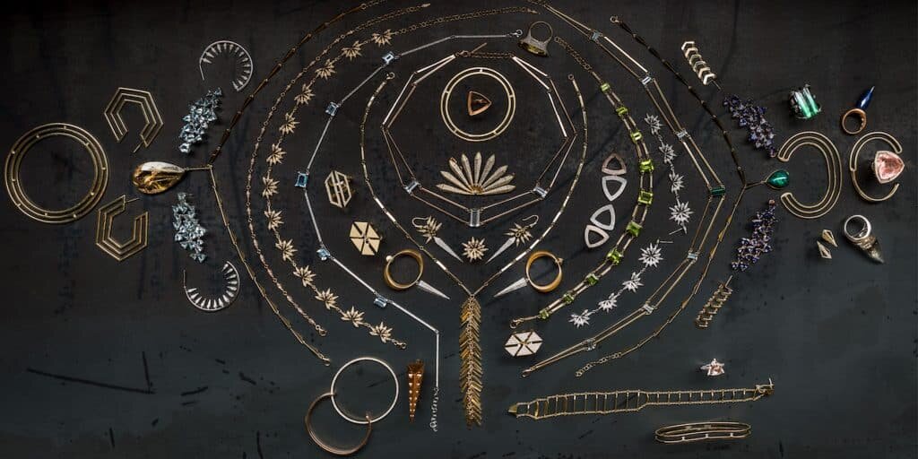 Кольцо Floating Triangle (в центре справа) Эль Халиль было вдохновлено крестообразным разрезом бетонной стены в Церкви Света Тадао Андо в Японии. Ее архитектурные наклонности также очевидны в кольце Geometric Triangle из желтого золота с бриллиантами и кольце Geometric Hexagon из 18-каратного желтого золота.
