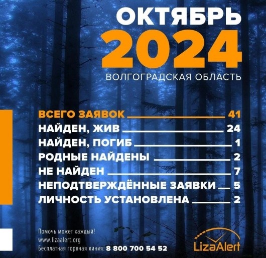 Всего в отряд за минувший месяц поступила 41 заявка на поиск пропавших людей по Волгоградской области. Более половины из числе пропавших, 24 человека, удалось найти живыми. К сожалению, один человек погиб. В ходе поисковых операций удалось установить личности двоих пропавших. Пять заявок на поиски в течении месяца были отклонены. Волонтеры продолжают поиски тех, кто не найден: распространяются ориентировки, проверяются свидетельства.