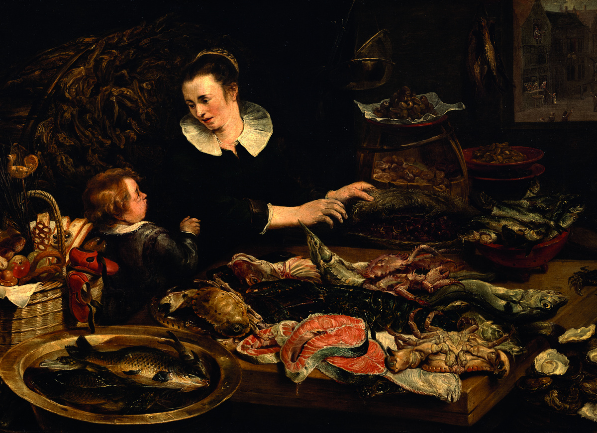 Рыбная лавка наполнена корзинами с морскими дарами, представленными в большом разнообразии, подчеркивающем жизненную силу природы. Это рыбы, креветки, устрицы, крабы. Скрытый смысл картины связан с рыбным постом, предваряющим празднование в начале декабре дня святого Николая, Синтер Класа.