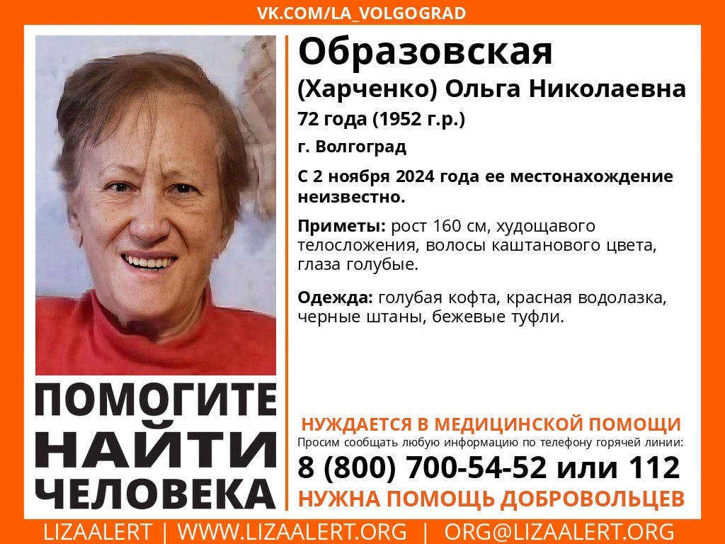 В Волгограде со 2 ноября ищут 72-летнюю пенсионерку Ольгу Образовскую. Поиски объявил отряд «Лиза Алерт». Пожилая женщина нуждается в медицинской помощи. Она не очень высокая, худощавого телосложения, волосы — каштанового цвета, глаза — голубые. Ольга Николаевна была одета не по погоде в голубую кофту, красную водолазку, черные штаны, бежевые туфли. Сейчас термометры, особенно по ночам, показывают минусовую температуру. Также с 3 октября идут поиски жителя Волгограда, 44-летнего Леонида Артеменко. Он высокий, худощавого телосложения, волосы русые с проседью, глаза зеленые. Был одет в черную кофту, черную футболку и такого же цвета штаны и серые кеды. А 27 октября в хуторе Сухов Михайловского района пропал без вести 42-летний Василий Анидалов. Мужчина нуждается в медицинской помощи. Он высокий, худощавый, кареглазый и темноволосый. Был одет в черную куртку, черные штаны и черную шапку. Любую информацию о пропавших людях можно сообщить в правоохранительные органы. У нас есть закрытый те