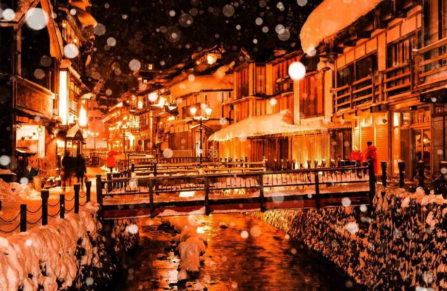 В Японии насчитывается порядка 25 тысяч горячих источников. Вокруг многих из них появилась инфраструктура: бани и гостиницы, где можно отдохнуть. Одно из таких мест ― живописный городок Гинзан-Онсэн в префектуре Ямагата. Через городок протекает река, а неподалеку есть не только горячие источники, но и водопад. Но он привлекает туристов не только природными красотами, но и архитектурой: здесь нет современных строений, все здания выстроены в классическом японском стиле. И они совершенно волшебные!