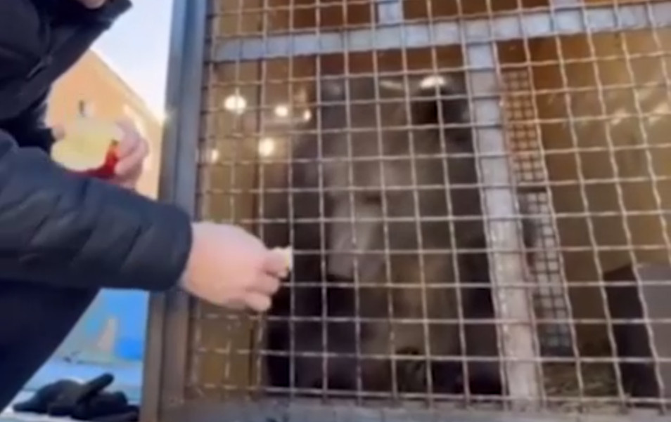 Ожидание перед полётом маленький косолапый заедал угощением — яблоками. После перелёта малышу предстоит пройти карантин в частном парке «Земля Прайда». Фото: скрин с видео из телеграм-канала парка «Земля прайда». Читайте на сайте информационного агентства «Камчатка»