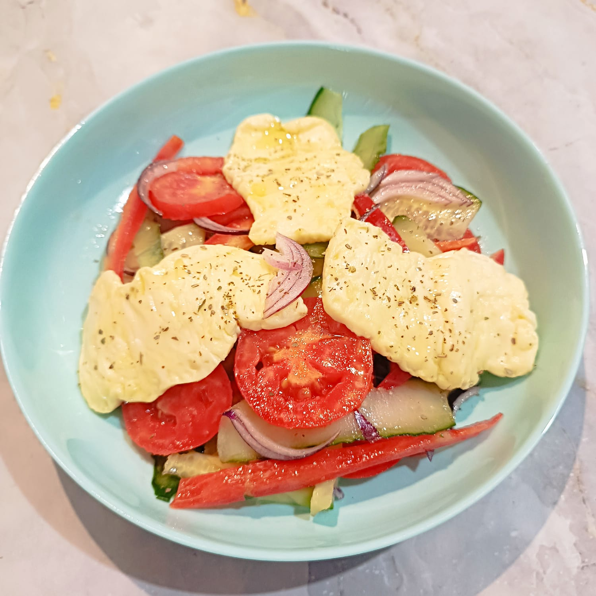 Доброе утро! Местные помидоры уже сдают свои позиции и вкус у них уже не такой яркий и насыщенный. Поэтому с салатами временная межсезонная заминка ) А всё лето и раннюю осень салат был = вкусные летние помидоры+огурцы/перец/лук/зелень и прочие овощи ) Но всё же помидоры ещё есть и я их использую с разными вкусными дополнениями. В том числе с жареным сыром. Это красиво, вкусно и интересно. Я покупаю брынзу у одного и того же продавца на рынке, и вот в крайний раз она мне говорит - эту брынзу можно и пожарить, она не развалится и не расползётся, чем меня заинтересовала ) Можно ещё обжаривать адыгейский сыр и сыр халуми. Готовлю салат - огурцы тонкими полосками на тёрке или овощечистке или кружочками, болгарский перец тонкой длинной соломкой, фиолетовый лук перьями, помидоры кружочками = мельчить не стоит. Я вообще сторонница крупной нарезки. А это блюдо сродни закуске, хоть и салат ) Можно листовую зелень добавить, я забыла о ней ) и/или оливки. Приправить морской солью, миксом пер