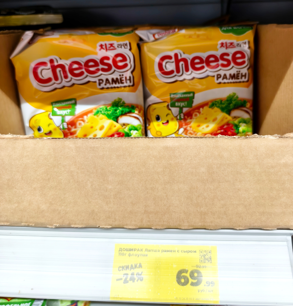 Всем привет! Частенько я видел эту бэпэшку на полках магазинов, но никогда не брал. Такие сырные вкусы меня всегда отталкивают. И не только в бэпэшках, а в любых продуктах. А именно вкус химического сыра. Он резкий и не похож на обычный сыр. Тут же мне посоветовал читатель попробовать, ну я и решил взять. Тем более в Магните по акции цена была нормальная. 70 рублей за большую пачку 110 граммов. Производитель обещает изысканный сырный вкус. Как-то не верится. Изготовитель: ООО "Доширак Рязань", г. Рязань. В составе пшеничная лапша с добавками. Лапша во всех чан раменах от Доширака одинаковая. Недавно пробовал суперострый вкус. Там была точно такая же лапша. Порошок из сыра чеддер есть и в бульонной приправе, и в дополнительной сырной. Из специй только чёрный перец. Из овощей стандартный набор из капусты, лука и моркови. Эту лапшу надо варить, но бульон тут не сливается. Буду готовить по рецепту. В комплекте брикет лапши. Три пакетика. 10 граммов бульонной приправы, 8 граммов с