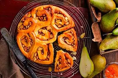 Сочные груши придают восхитительную сладость этим мягким и пышным дрожжевым булочкам, дополняя их орехово-абрикосовую начинку. Разделите их на части и наслаждайтесь, пока они ещё тёплые, прямо из духовки. Готовятся они несложно. Вот рецепт булочек с грушей. Ингредиенты необходимые для их приготовления: