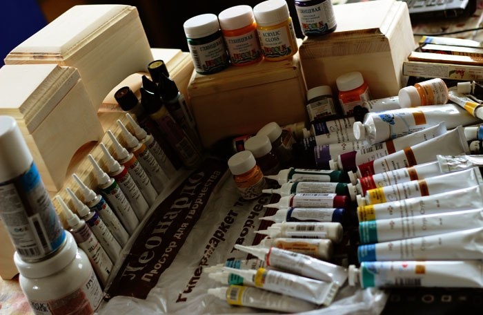 С технической стороны всё просто: вот заготовки, вот краски, вот руки и нужный плейлист. Рисуй. Рисуй все, что исходит из этих рук. С другой стороны.. Я никогда не знаю, какие цвета попросит каждая шкатулка. Во что сложится орнамент. И какое имя прилетит потом в готовый ларчик.
