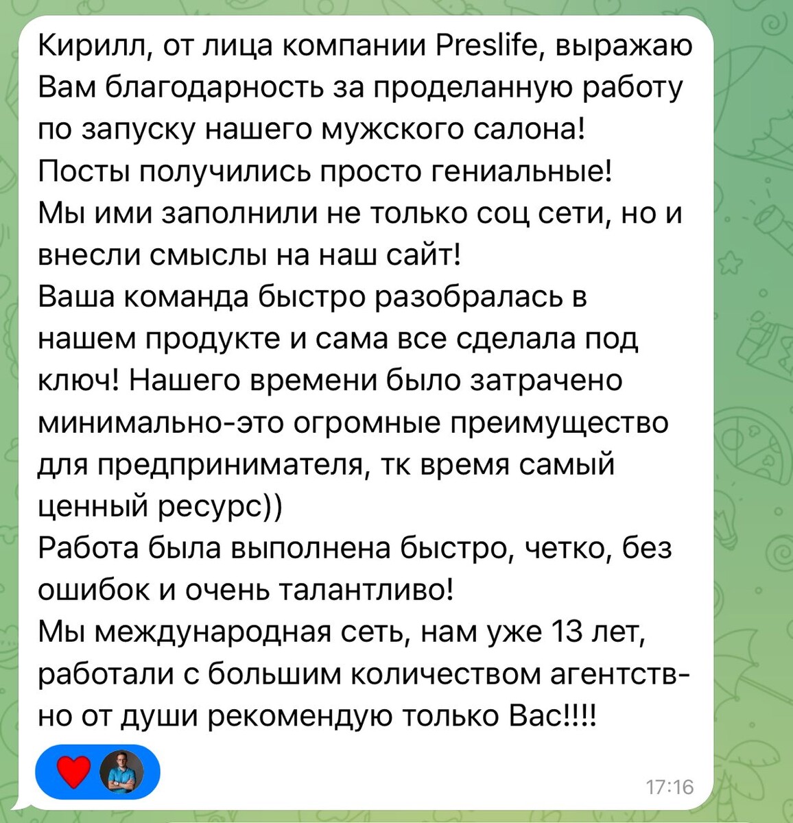 Приведу пример нашего клиента – мужской салон красоты. Которые обратились к нам на этапе открытия бизнеса. И уже к открытию салона получили сформированный канал с контентом. Закупили рекламу и получили первых клиентов. Также тексты они использовали для своего сайта.