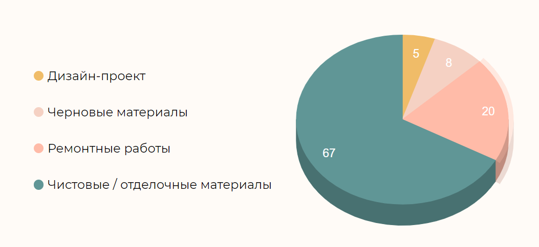 Мечтаете о стильном и современном дизайне квартире, но не понимаете, как правильно рассчитать бюджет? В этой статье команда студии дизайна интерьера YOURSPACE расскажет: Тот самый вопрос, который волнует всех, кто начинает ремонт в своей квартире :) Увы, точного ответа нет. Существует много факторов, которые необходимо учесть. Например, сложность дизайн-проекта, цена различных отделочных материалов, оборудования и мебели. Стоимость и процентное соотношение статей расходов на ремонт квартиры в Москве может отличаться. Исходя из опыта нашей команды и регулярного мониторинга рыночных цен, распределение бюджета происходит следующим образом - мы отразили его в диаграмме ниже. Вывод простой: самая большая статья расходов — это стоимость чистовых/отделочных материалов. Она составляет примерно 70% от всего бюджета. Именно поэтому мы всегда просим наших клиентов озвучивать реальную сумму, которую они готовы потратить на ремонт. Комплектатор и дизайнеры студии YOURSPACE подбирают каждую позицию