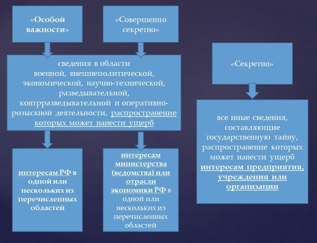 ✏ Существует три степени секретности сведений: "особой важности", "совершенно секретно" и "секретно". Подробнее на прикрепленном изображении.