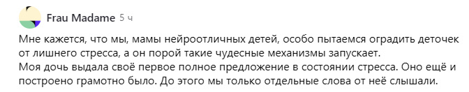 Комментарий такой поступил: Не могу не согласиться с автором комментария. Да, стресс может запустить разные чудесные механизмы. Но он же может и уничтожить изначально слабого человека. И вот я там ответила кратко, здесь разверну. Мне кажется, мы, те самые мамы, в итоге путаем причину и следствие своих действий. А уж как их путают люди, которые нас наблюдают со стороны. В частности, в интернете. О чём я? О том, что мы часто делаем что-то, потому что прошлый опыт показал, что эти действия эффективны, а другие нет. В случае с больными психически детьми наши действия могут выглядеть совершенно неправильно. Но... если не учитывать, что перед нами психический ребёнок. Пример. Вот просто ребёнок расстроился, поплакал, успокоился, живёт дальше. Не очень простой ребёнок расстроился, поплакал и ушёл в откат на полгода. Утратил навыки!!! И все мы это знаем. Только со временем забываем... почему мы так оберегаем этих чудных товарищей. Да потому что разваливаются они на части непредсказуемым