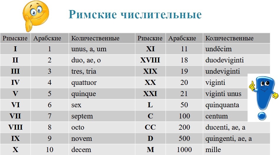 Количественные числительные от 1 до 10, 20, 100 и 1000 считаются основными. Названия десятков 30-90 и сотен 200 - 900 являются производными от основных. Количественные числительные от 11 до 17 образуются присоединением суффикса - dĕcim (decem - 10) к основному числительному. Например: un-dĕcim - 11, quattuor-dĕcim - 14, septen-dĕcim - 17. Десятки от 30 до90 образуются присоединением к основному числительному форманта - ginta, например, tri-ginta - 30, sexa -ginta - 60. Cотни 200-900 образуются при помощи форманта - centi, ae, a (от centum): non-centi, ae, a - 900; ses-centi, ae, a. А вот 18,19; 28, 29; 38, 39; 48, 49 и так далее образуются вычитанием из последующего десятка, то есть 20, 30, 40... : duo-de-viginti - 18 (20 без 2). Числительные 21-27, 31-37, 41-47... образуются двумя способами: