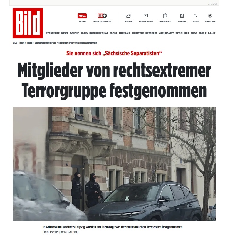 Немецкий таблоид Bild пишет, что сегодня по ордерам Генпрокуратуры ФРГ были арестованы сепаратисты, готовившие отделение Саксонии от Германии. Сообщается, что речь идет о восьми членах правоэкстремистской террористической группировки «Саксонские сепаратисты», основанной не позднее ноября 2020 года и состоящей из 15-20 человек. «Её члены разделяют глубокое неприятие основного свободного демократического строя Федеративной Республики Германия. Их идеология характеризуется расистскими, антисемитскими и отчасти апокалиптическими идеями. С точки зрения группировки, не подлежит сомнению, что Германия находится на грани “краха” и что государственный и социальный коллапс произойдет в “День X”» — говорится в сообщении генпрокуратуры ФРГ. Федеральная прокуратура объявила, что выдала ордера на арест Курта Х., Карла К., Кевина М., Ханса-Георга П., Кевина Р., Йорга С., Йорна С. и Нормана Т. в различных местах в и вокруг Лейпцига , в Дрездене , городе в округе Мейсен ( Саксония ) и в Польше. Одновре