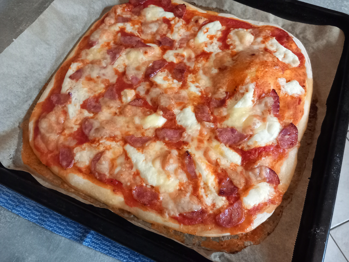 Сегодня пицца квадратная! Так её получается больше, чтоб дети сладкое не тягали, пока мама в сауне😃. Соус: помидоры в собственном соку перебила блендером, соль, сахар, базилик. Моцарелла кусочками. Колбаса копчёная, один уголок без колбасы, старшая её не ест. Сверху ещё твёрдый сыр, который был дома. Ещё десять минут терпения и пицца готова👍👍👍😃 И все счастливы !!
