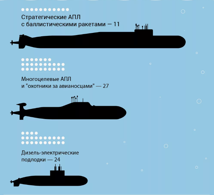 Российский ВМФ имеет три основных вида подводных лодок: стратегические атомные, многоцелевые атомные и дизель-электрические. Основным оружием стратегических АПЛ являются межконтинентальные трехступенчатые ракеты с ядерной боеголовкой "Булава" или "Синева". На АПЛ типа "Борей" их установлено 16 шт. Каждая баллистическая ракета "Синева" несет 10 ядерных боеголовок общей мощностью 1 мегатонна в тротиловом эквиваленте. ("Булава" до 2 мегатонн), что составляет 50 бомб сброшенных на Хиросиму и Нагасаки. Стратегические подводные лодки ведут постоянное боевое дежурство и готовы в любое время поразить любые объекты, находящиеся в любой части земли. Благодаря тому, что боевые блоки имеют сверхзвуковую скорость, они практически не сбиваются силами ПВО. Многоцелевые АПЛ в качестве главного оружия несут крылатые ракеты "Оникс" или "Калибр". Лодка проекта "Ясень" имеет на борту 32 ракеты "Оникс" или 40 ракет "Калибр". Каждая ракета "Калибр" несет на расстояние до 2500 км 400 кг осколочно- фугасного
