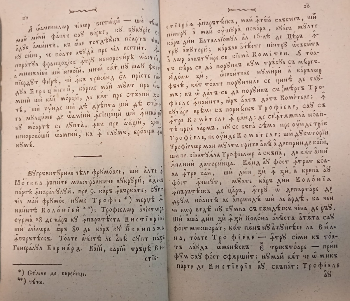 A oamenilor celor vestiți - și cele mai mici fapte sau vorbe, cu bucurie se aduc aminte, că iale totdeauna poartă ceva cu sine, ce poate lăuda pre cel vestit. Înpăratul franțozesc întru nenorocirea oastei, a mișăliei și nevoii, nici cât nu șiua fost pierdut firea, ci încă trecând el preste podul Bereținei, carele mai mult pre oameni și cai morți, de cât pre stâlpii zăce, și unde și dea dreapta și dea stânga mulțime de oameni înghiețați și înnecați cu moartea se lupta, încă pre acești, zic, nenorocoși oameni, ca în glumă, broaște îi numea. _____________________ Zugrăviturile cele frumoase, și alte în Moscva răpite măestrelnice lucruri, adecă partea înpăratului, pre 9. cară încărcate, supt cel mai frumos nume Trofee *) mergea înnaintea Coloniei **); Trofeelor acestora urma 28 de cară cu înpărăteasca Vistierie; și acelora iară 80 de cară cu Echipaja înpărătească. Toate acestea le avea supt pază Generalul Bernard. Caii, carii trăge vistieria înpărătească, mai întâiu slăbisă, și pentru a m