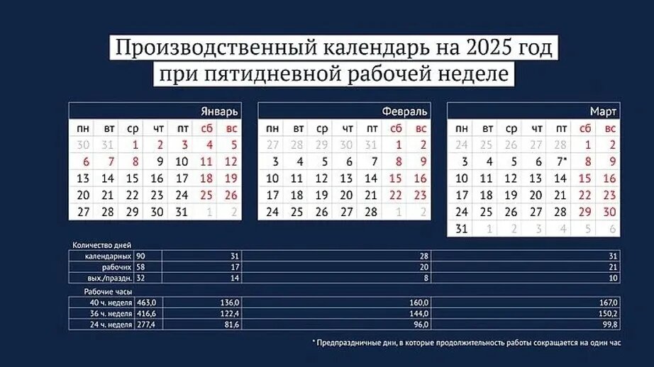 В России утвержден производственный календарь на 2025 год. Это — график, в котором определены все рабочие, выходные и праздничные дни. «Красный Север» расскажет, когда россияне будут отдыхать, и в какие месяцы лучше планировать отпуск. Правительство России своим постановлением утвердило график праздничных и выходных дней на будущий год. Согласно документу, в 2025 году россиян, которые трудятся на пятидневке, ожидают 247 рабочих дней, 118 выходных и праздничных. Для четырех дней года установлен сокращенный на один час график. По традиции, самыми ожидаемыми и долгими станут новогодние и рождественские праздники. Отдыхать начнем с последних дней уходящего года — с 29 декабря, закончим — 8 января 2025 года (всего — 11 дней). Поскольку 4 и 5 января выпадают на субботу и воскресенье, то эти нерабочие праздничные дни перенесли на 2 мая (пятницу) и 31 декабря (среду). Первая рабочая неделя года не сильно утомит работников: она состоит всего из двух дней — 9 января (четверг) и 10 (пятница). Пра