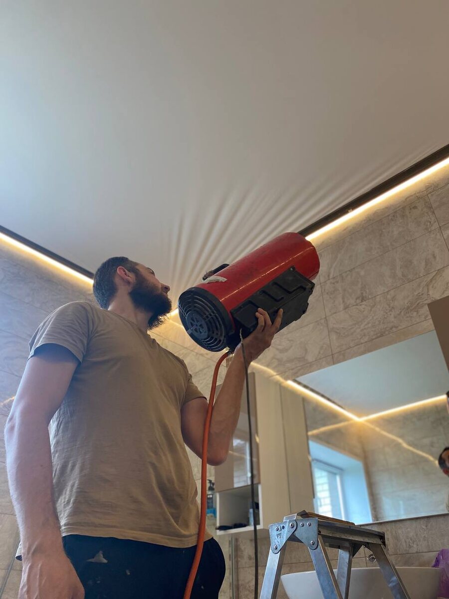 Отсюда и название - натяжные потолки. Как делают монтаж? Пленку разворачивают и разогревают тепловой пушкой.