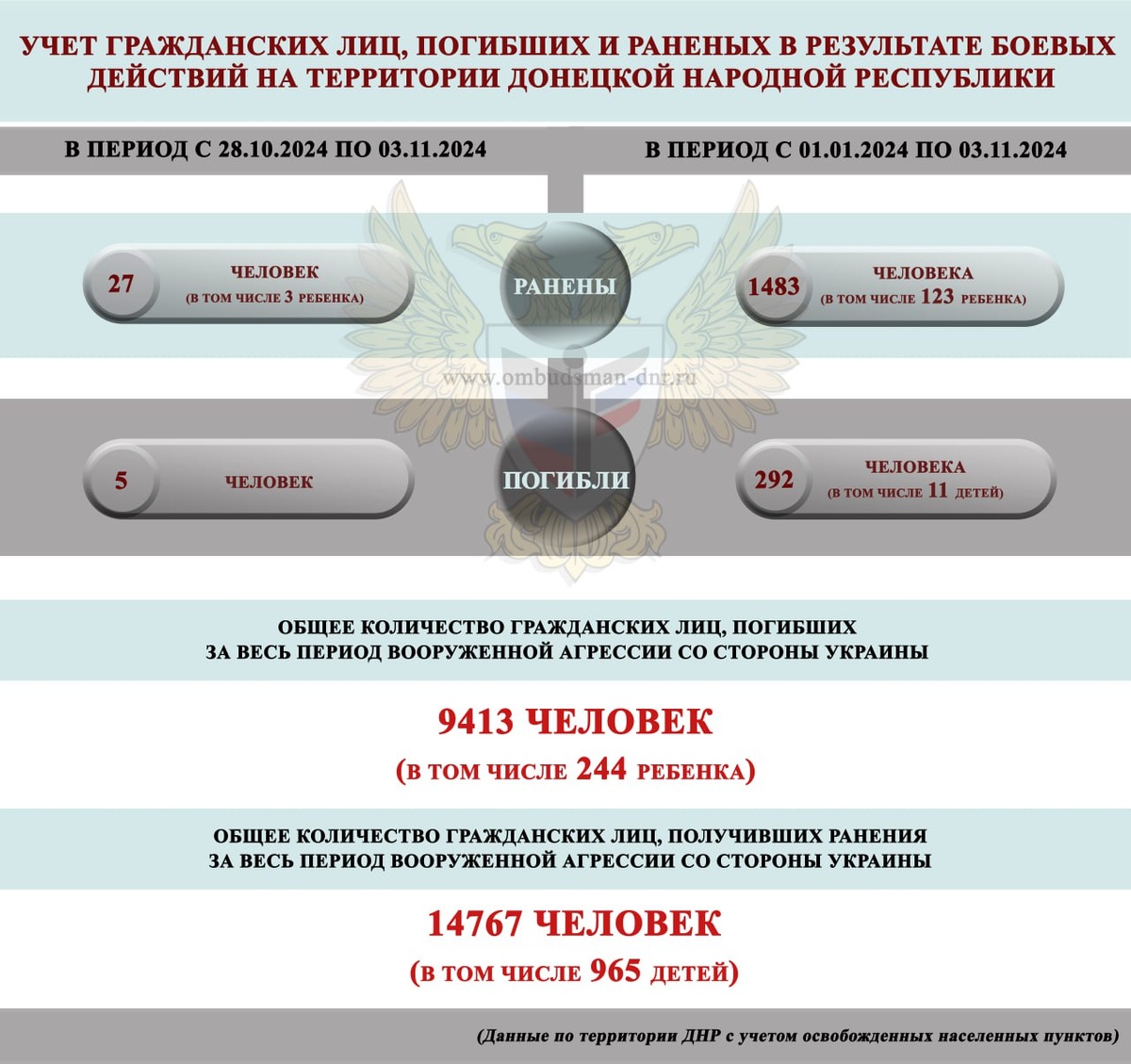 Полная версия:https://ombudsman-dnr.ru/obzor-soczialno-gumanitarnoj-situaczii-slozhivshejsya-na-territorii-doneczkoj-narodnoj-respubliki-vsledstvie-voennyh-dejstvij-v-period-s-28-oktyabrya-po-03-noyabrya-2024-g/