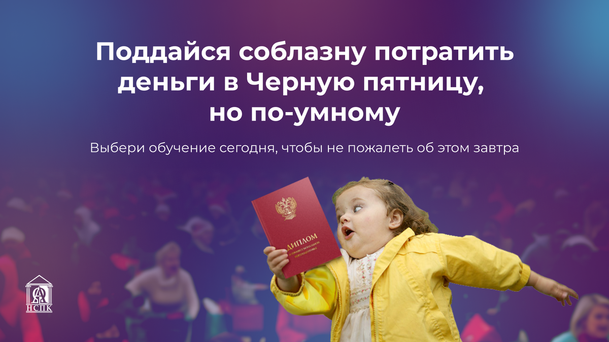 Черная пятница — это большие скидки, ажиотаж и часто нерациональные покупки. Пора использовать этот день для важного инвестирования! Представьте, что вместо очередной вещи получите доступ к знаниям, навыкам и дипломам, которые откроют новые возможности. Теперь это доступно в Национальном социально-педагогическом колледже (НСПК). В Черную пятницу 2024 года НСПК увеличил скидки для поступающих. Теперь вы можете зачислиться на онлайн-обучение со скидкой до -38%.😮 ↙️ Но только в ноябре: Черная пятница в НСПК длится по 29 ноября 2024 года.🔔 Чтобы зафиксировать скидку, нужно просто оставить заявку и поступить до окончания Черной пятницы. Никаких дополнительных условий и промокодов. Оставить заявку Поступите в НСПК в Черную пятницу 2024 года, чтобы: 👉 Ухватить реально выгодную цену. Скидка до -38%. В 2025 году цены на обучение поднимутся и даже со скидкой не будут такими выгодными, как сегодня.🤩 👉 Поступить в 2024 году. В декабре приема не будет. Придется снова откладывать поступление на