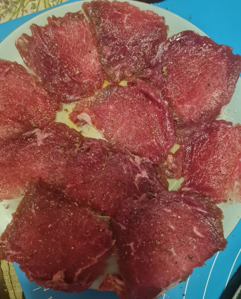 Для него нам понадобится замороженная мякоть говядины, которую надо нарезать тонкими слайсами. Нарезанные кусочки с каждой стороны солим, перчим по вкусу, укладываем на тарелку, сбрызгиваем растительным маслом. Ждем 15 минут и кушаем!!!